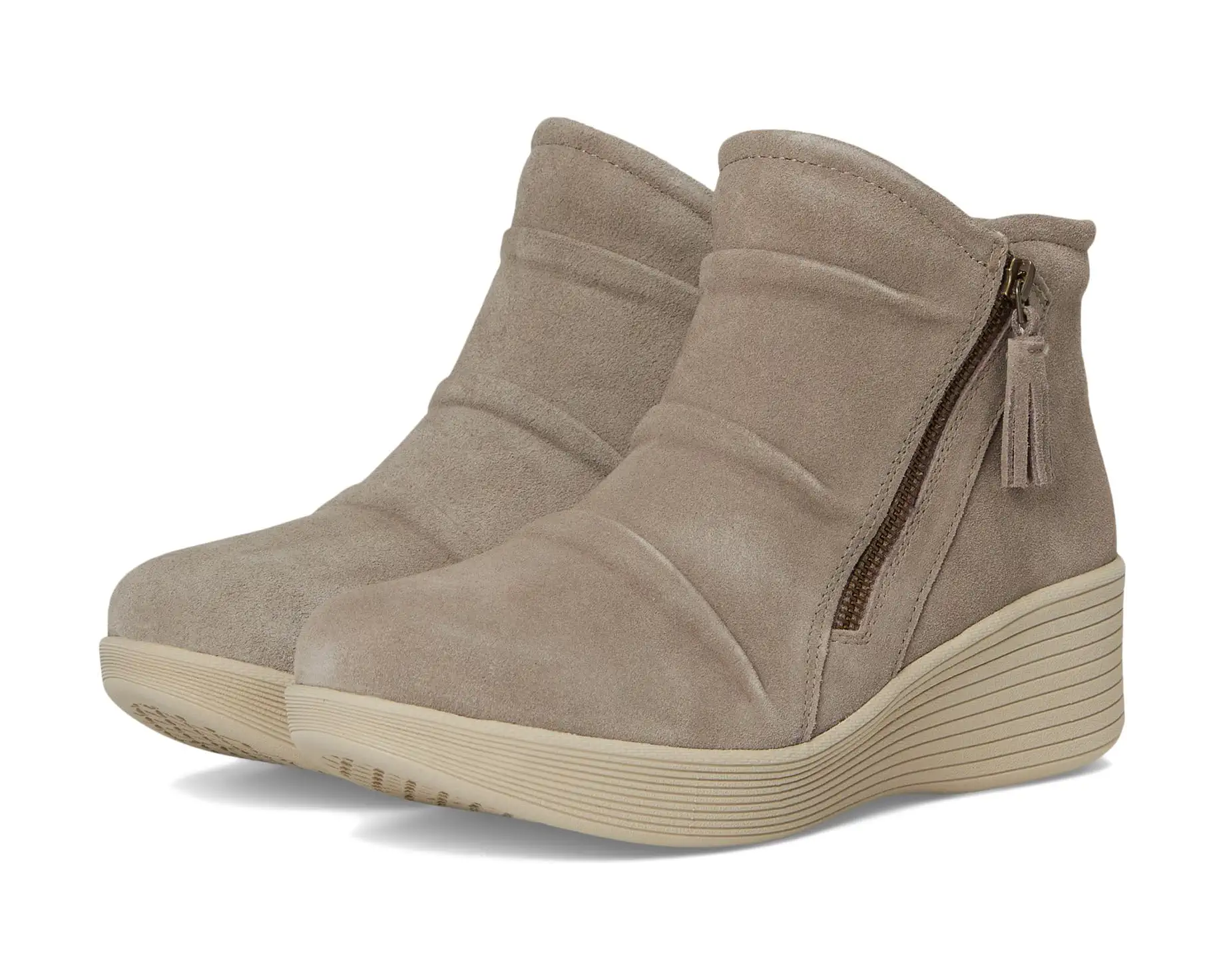 - Confidence in every step wearing SKECHERS® Parallel Lite. Designed with a sleek leather upper treated with 3M Scotchguard®, it resists water and stains so you stay polished no matter what the forecast brings. The zippered side closure ensures easy wear, while the ankle-high silhouette paired with a chic wedge heel gives you a lift that's both flattering and versatile. Inside, the Air-Cooled Memory Foam® cushioned comfort insole keeps every step breathable and supported, while the lightweight shock-absorbing midsole reduces impact so you can keep moving effortlessly from day to night. A fabric lining adds softness against the skin, while the durable rubber outsole provides dependable traction. Finished with a plain toe for timeless appeal, this casual wedge is the perfect balance of everyday function and elevated fashion.