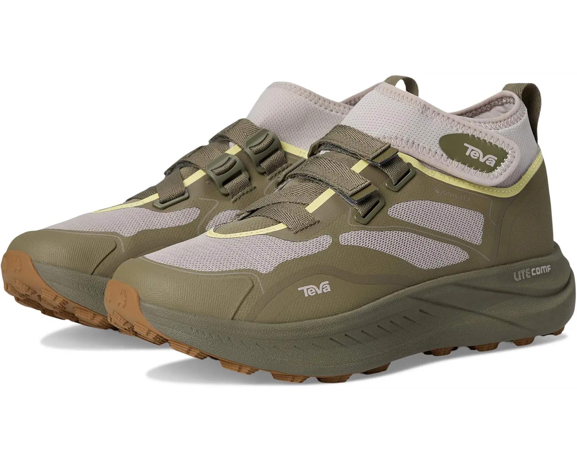 • Built for athletic adventures, the Teva® Trailwinder Mid GTX is light, fast, and unquestionably comfortable. Engineered with a cushy LITE-COMF midsole and waterproof GORE-TEX® membrane, we've enlisted tiered traction lugs for a secure grip on variable terrain. Reinforced with a durable toe cap and a protective neoprene ankle cuff, this durable outdoor shoe has you covered from slot canyon to switchback. The mid-top hiking shoes feature quick-dry mesh upper for lightweight breathability, a wrapped ankle cuff to keep unwanted debris and moisture out, and a dual-point closure system for independent forefoot and instep lockdown modularity.