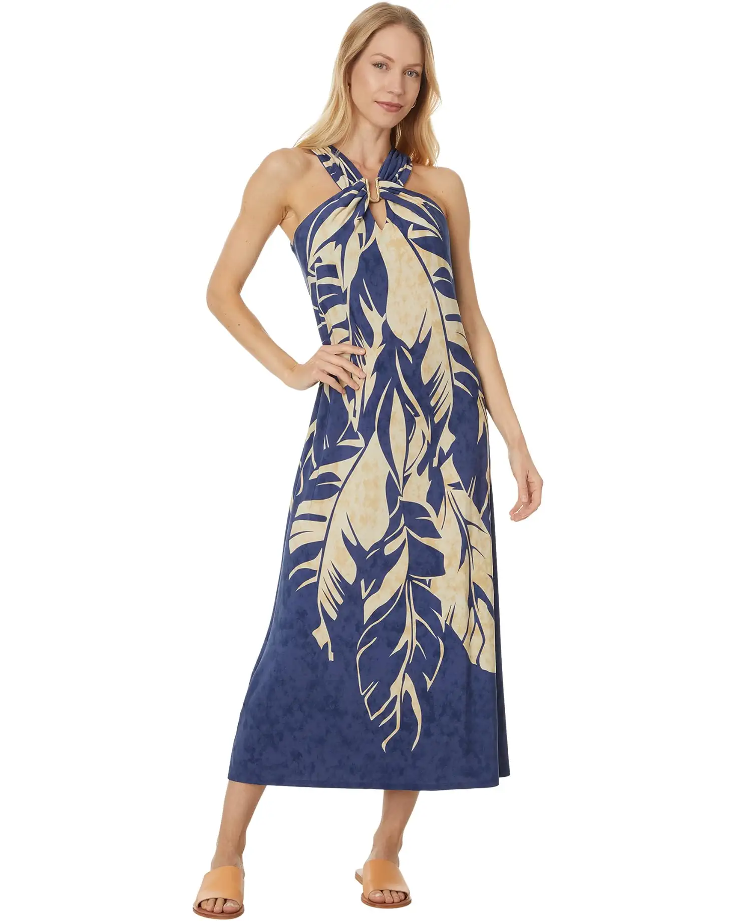 • The Tommy Bahama® Regal Fronds Halter Midi Dress is an engineered Carmela printed jersey midi dress that is perfect to flaunt your fashionista side. This printed dress comes with a sleeveless style, a halter neckline, and a straight hem. The wrinkle-resistant polyester blend fabric offers superior comfort while the UPF 30 protection shields your skin from harmful sun rays, making it a great addition to your wardrobe.
