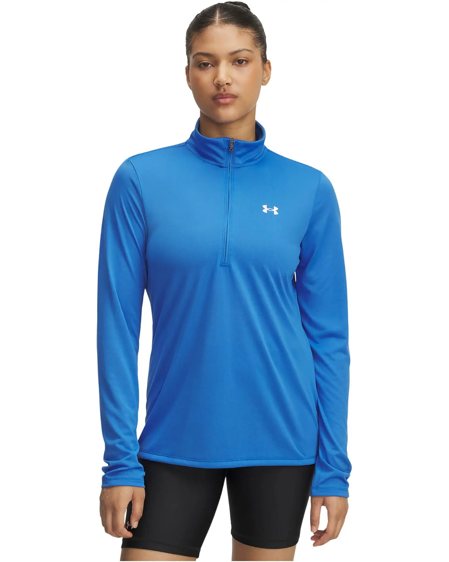 - Stay comfortable while enjoying fun movements at outdoors by wearing Under Armour® Tech 1/2 Zip Solid tee. It features a collared neckline with quarter front zipper closure, long sleeves, and straight hem. A signature logo on the left chest gives it a sporty look.