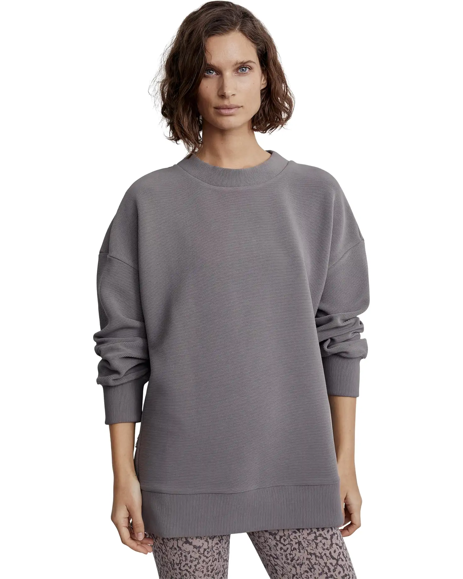 - Experience the epitome of casual comfort with the Varley Mae Boyfriend Sweat. This sweatshirt features a crew neckline that exudes classic style. Long sleeves along with dropped shoulder design enhance the relaxed vibe, while the oversized fit adds a touch of effortless cool. The side zips on the hemline provide a unique detail, making it a versatile and stylish addition to your wardrobe.