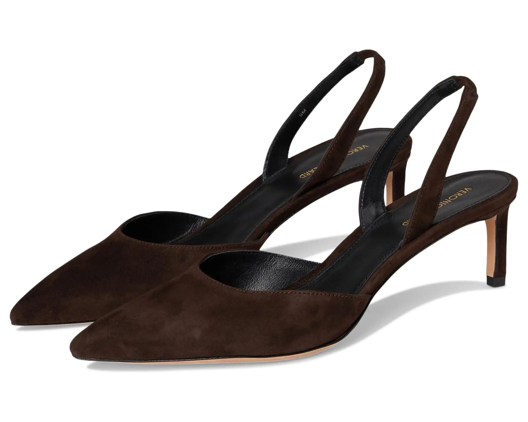 - Step into timeless elegance wearing the Veronica Beard® Caroline. Designed with a luxe suede upper and supple leather lining, insole, and outsole, this slingback pump is a modern nod to vintage charm. The sleek pointed toe adds sharp sophistication, while the mid-height kitten heel offers just the right lift for all-day comfort. An elasticized slingback strap keeps every step secure yet graceful, making this slip-on style your go-to for polished looks.