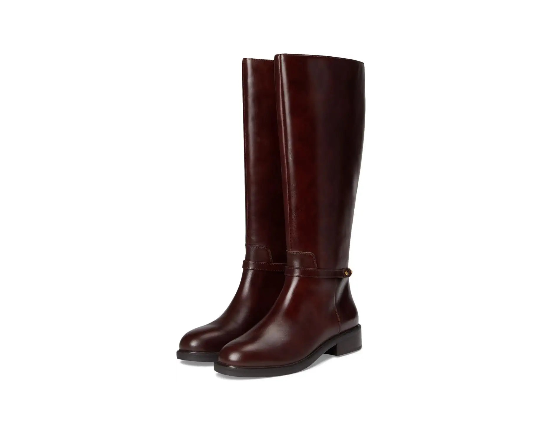 - Vince Camuto® Adria Ankle Link Knee High Riding Boot: Clean hardware details the heel strap on this riding-inspired boot. With a smooth leather knee-high silhouette, this boot is timeless. A sleek almond toe design and low stacked heel keep it versatile and wearable.