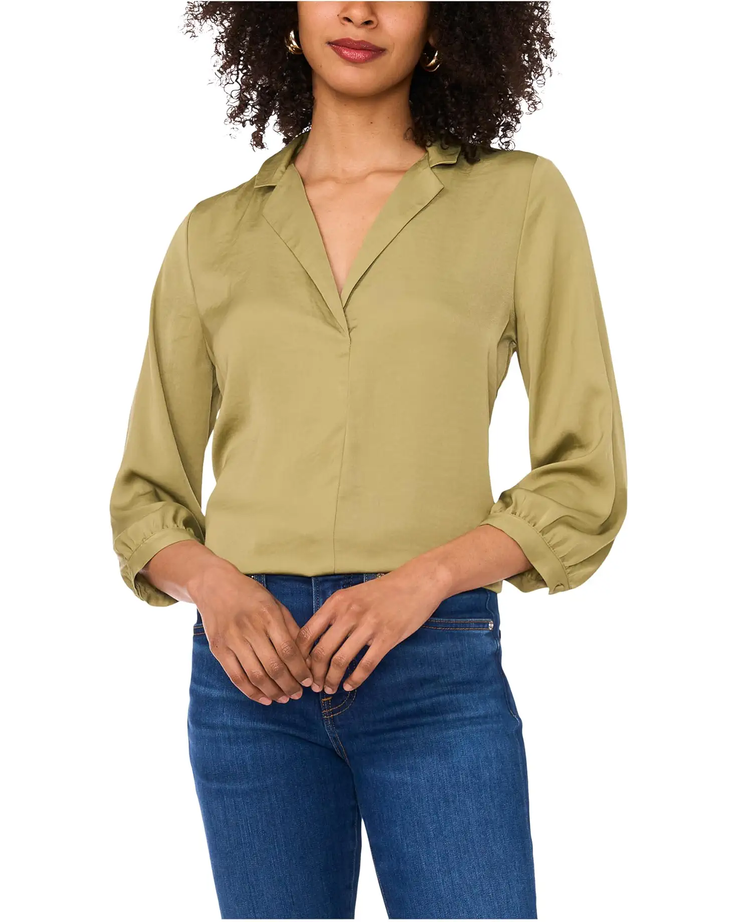 - Style your look in the flirty femme Vince Camuto® Collared V-Neck Long Sleeve Blouse. The pull-on style top features a collared V-neckline, three-fourth sleeves with buttoned cuffs, and a straight hem.
