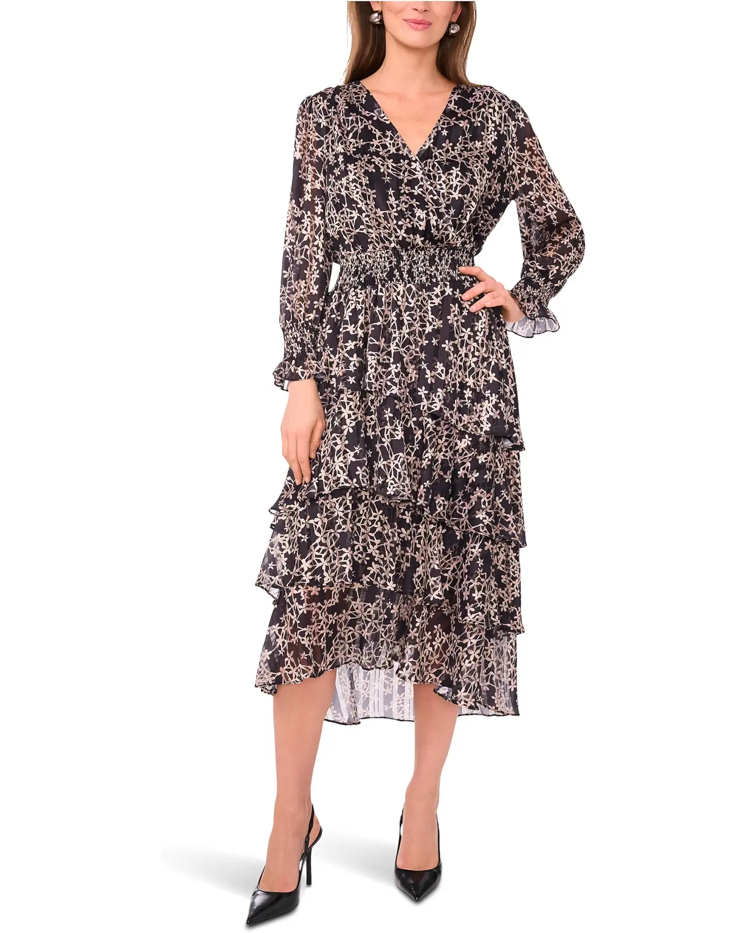 • Add the perfect balance of elegance to your chic style in the Vince Camuto® Long Sleeved V-Neck Maxi with Tiered Skirt. Featuring a V-neckline, long sleeves with ruffle cuffs, smocked waist and a tiered skirt.