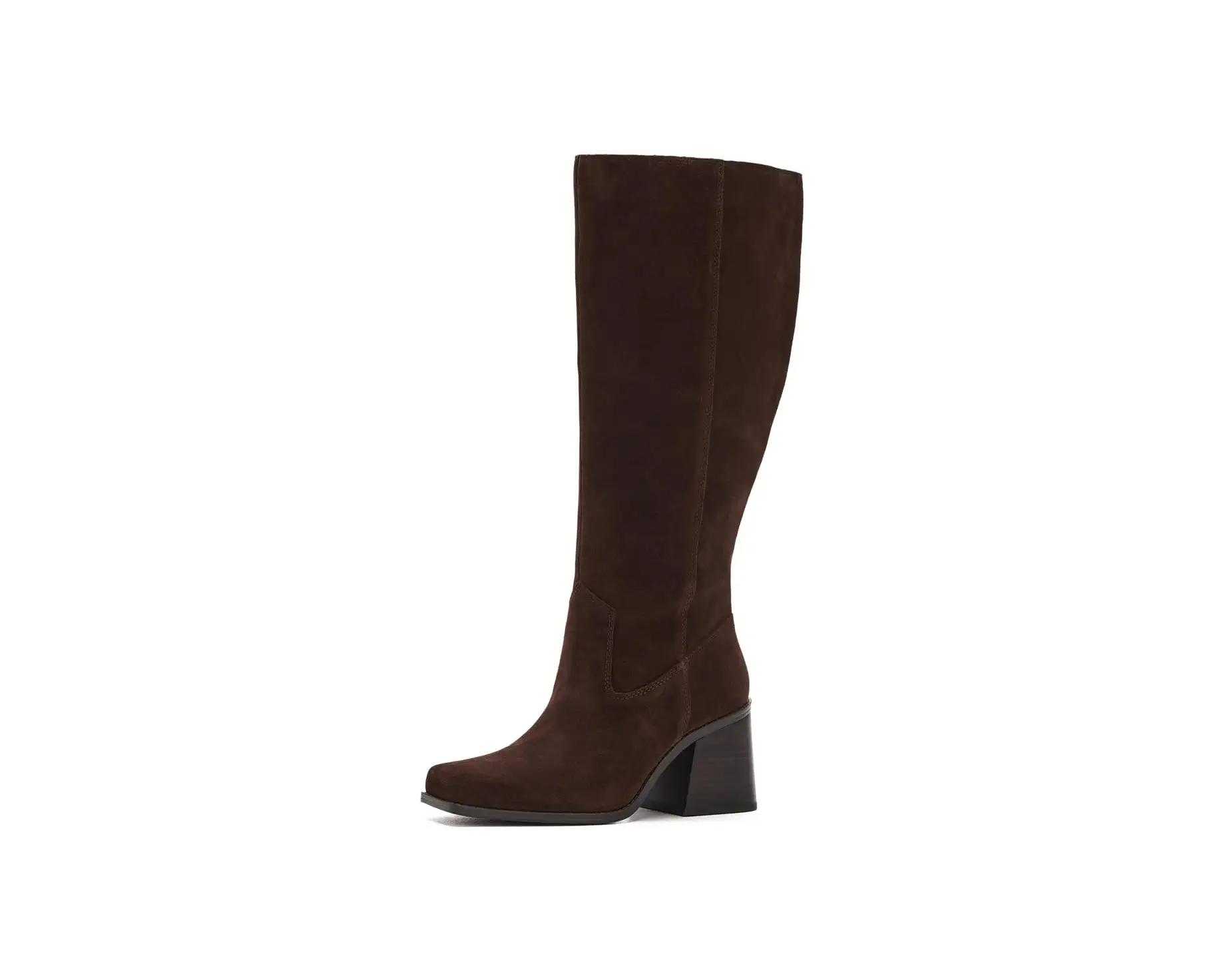 - The Vince Camuto® Sangeti Wide Calf Stacked Heel Knee High Boot showcases a sleek silhouette with a square toe, stacked block heel, and refined seam detailing. A zippered side closure ensures easy wear, while the padded polyester footbed and gore along the topline enhance flexibility and comfort.