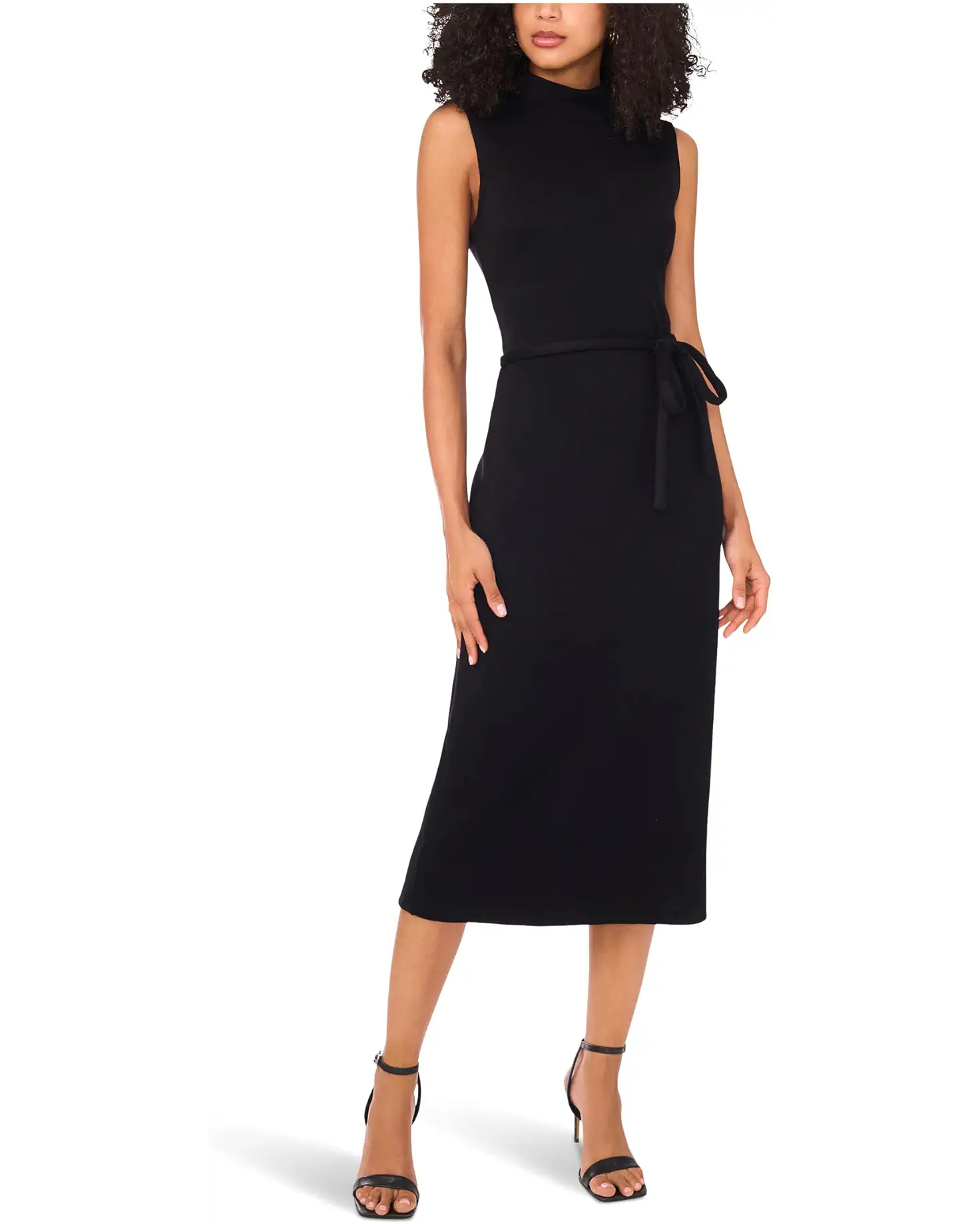- Meet the Vince Camuto® Sleeveless Mockneck with Thin Belt Dress, your new go-to for modern elegance. Designed with a refined mock neck and sleeveless silhouette, this dress strikes the perfect balance between timeless sophistication and contemporary style. Falling gracefully below the knee, it offers a flattering length that works seamlessly for both professional settings and special evenings out. The thin tie belt at the waist creates a cinched, feminine shape, while the easy pull-on style ensures comfort and convenience without compromising on design. Lightweight and versatile, this dress transitions flawlessly from desk to dinner, pairing beautifully with heels, flats, or layered accessories for endless styling possibilities.