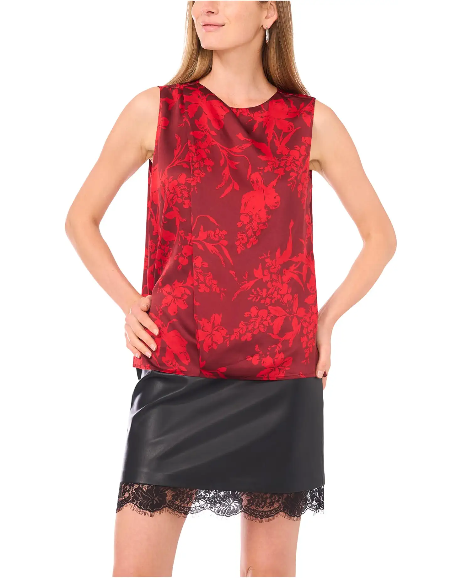 - The Vince Camuto® Tank w/ Draped Neck and Center Front Pleat features a draped neckline that softly folds for a graceful silhouette, complemented by a center front pleat that adds movement and structure. With an allover floral print, it has a sleeveless design and offers pull-on ease.