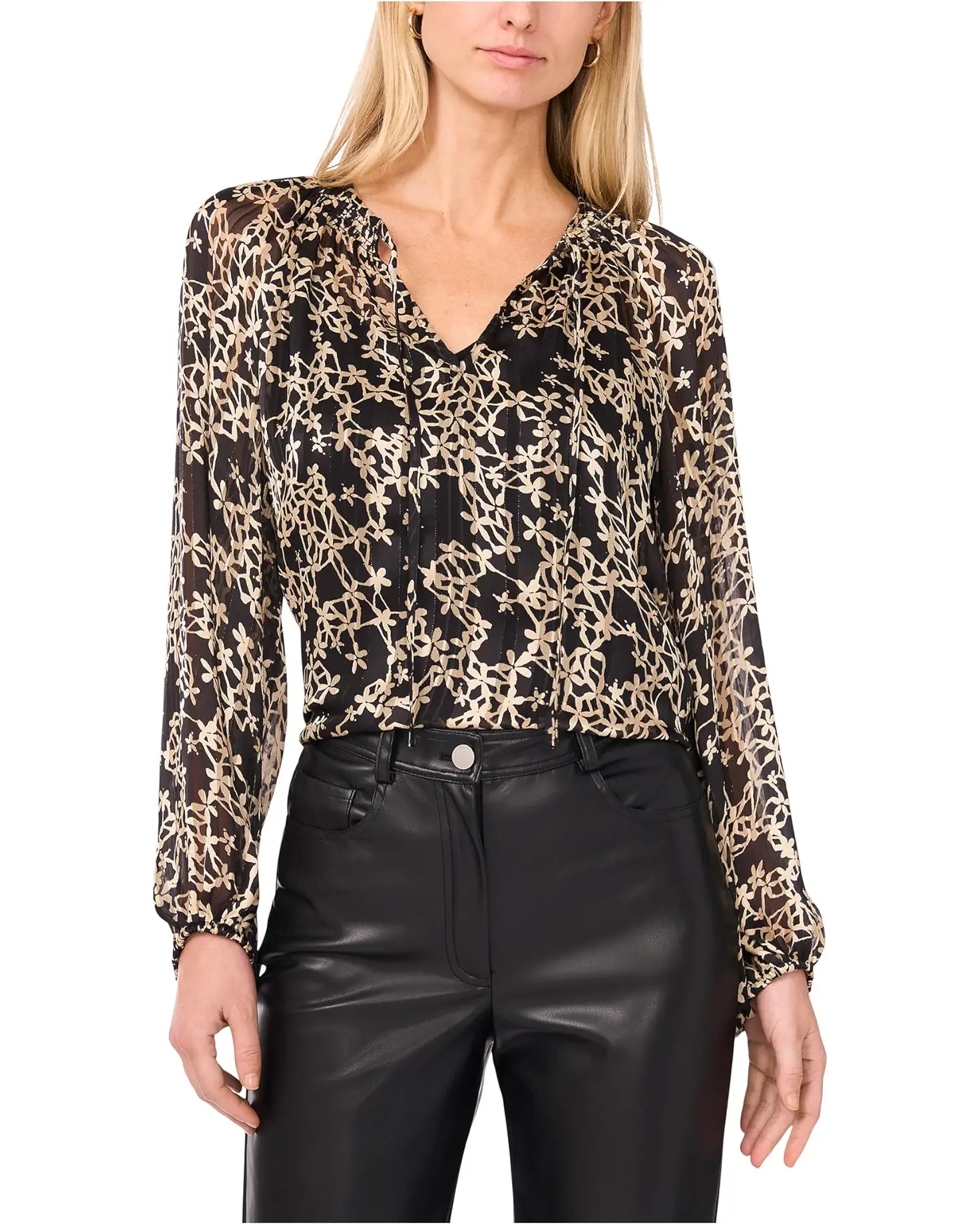 - Shine effortlessly wearing the Vince Camuto® Tie Neck Shirring Long Sleeve Top, while elegance meets comfort. The pull-on style top features a V-neckline with tie-up detail, long sleeves, a straight hem, and a subtle allover print.