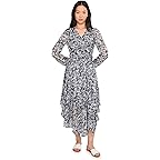 - The Vince Camuto® V-Neck Tie Waist Maxi Dress blends style and comfort for an effortlessly chic statement look. The dress features a V-neck, long sleeves, tie-up waist detail, back-zipper closure, allover floral print, and an asymmetrical hem that is intended to hit below the knees.