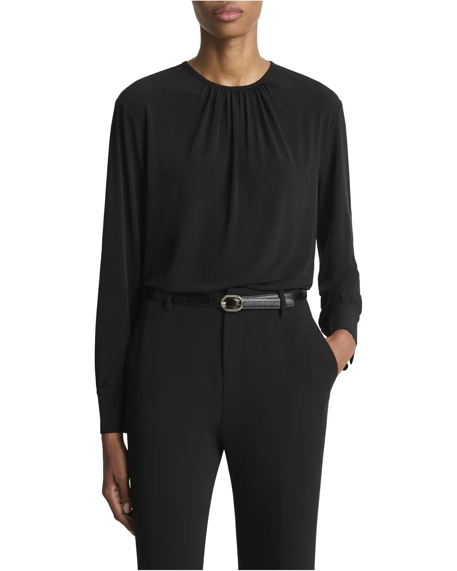 - Crafted with a light, drapey finish, gathered neckline, and long sleeves, this elegant Vince® Soft Gathered Blouse adds instant polish to skirts, trousers, and denim alike. Designed with a relaxed, slightly oversized silhouette, the blouse features a delicate keyhole on the back, fastened with a subtle button closure for ease and elegance.